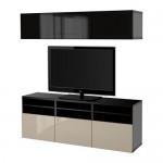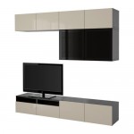 БЕСТО Шкаф для ТВ, комбин/стеклян дверцы - черно-коричневый/Сельсвикен глянцевый/бежевый/дымчатое стекло, направляющие ящика,нажимные