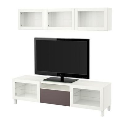 БЕСТО Шкаф для ТВ, комбин/стеклян дверцы - белый/Вальвикен темно-коричневый, прозрачное стекло, направляющие ящика, плавно закр