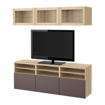 БЕСТО Шкаф для ТВ, комбин/стеклян дверцы - под беленый дуб/Вальвикен темно-коричневый, прозрачное стекло, направляющие ящика,нажимные