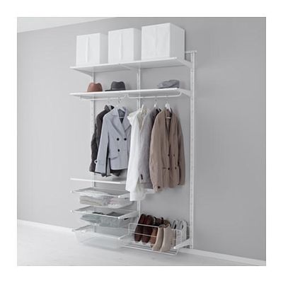 -Модули АЛЬГОТ можно использовать для хранения одежды. Установив полки вверху и секции для обуви внизу, вы используете имеющееся пространство максимально эффективно.