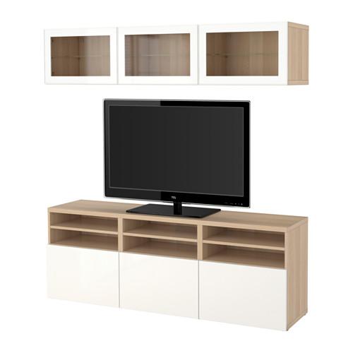 БЕСТО Шкаф для ТВ, комбин/стеклян дверцы - под беленый дуб/Сельсвикен глянцевый/белый прозрачное стекло, направляющие ящика,нажимные