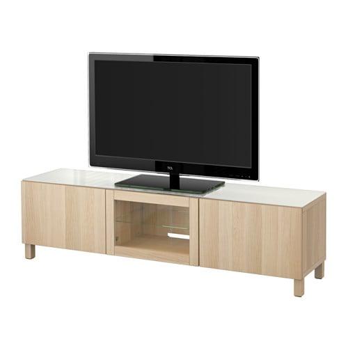 БЕСТО Тумба под ТВ, с дверцами - под беленый дуб/Лаппвикен под беленый дуб, прозрачное стелко, направляющие ящика, плавно закр
