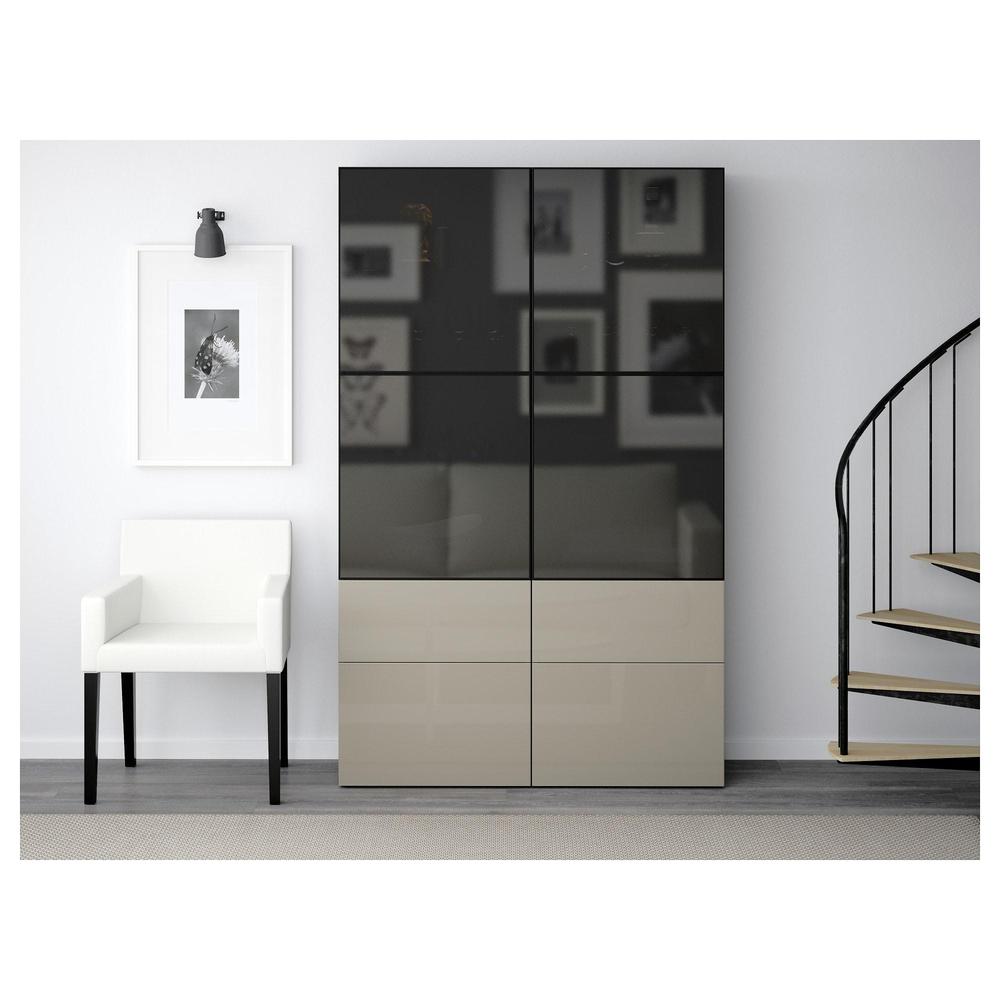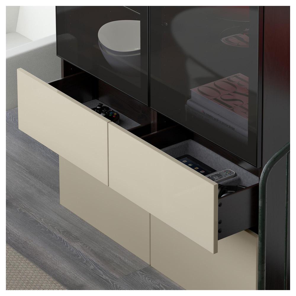 БЕСТО Комбинация д/хранения+стекл дверц - черно-коричневый/Сельсвикен глянцевый/бежевый/дымчатое стекло, направляющие ящика,нажимные