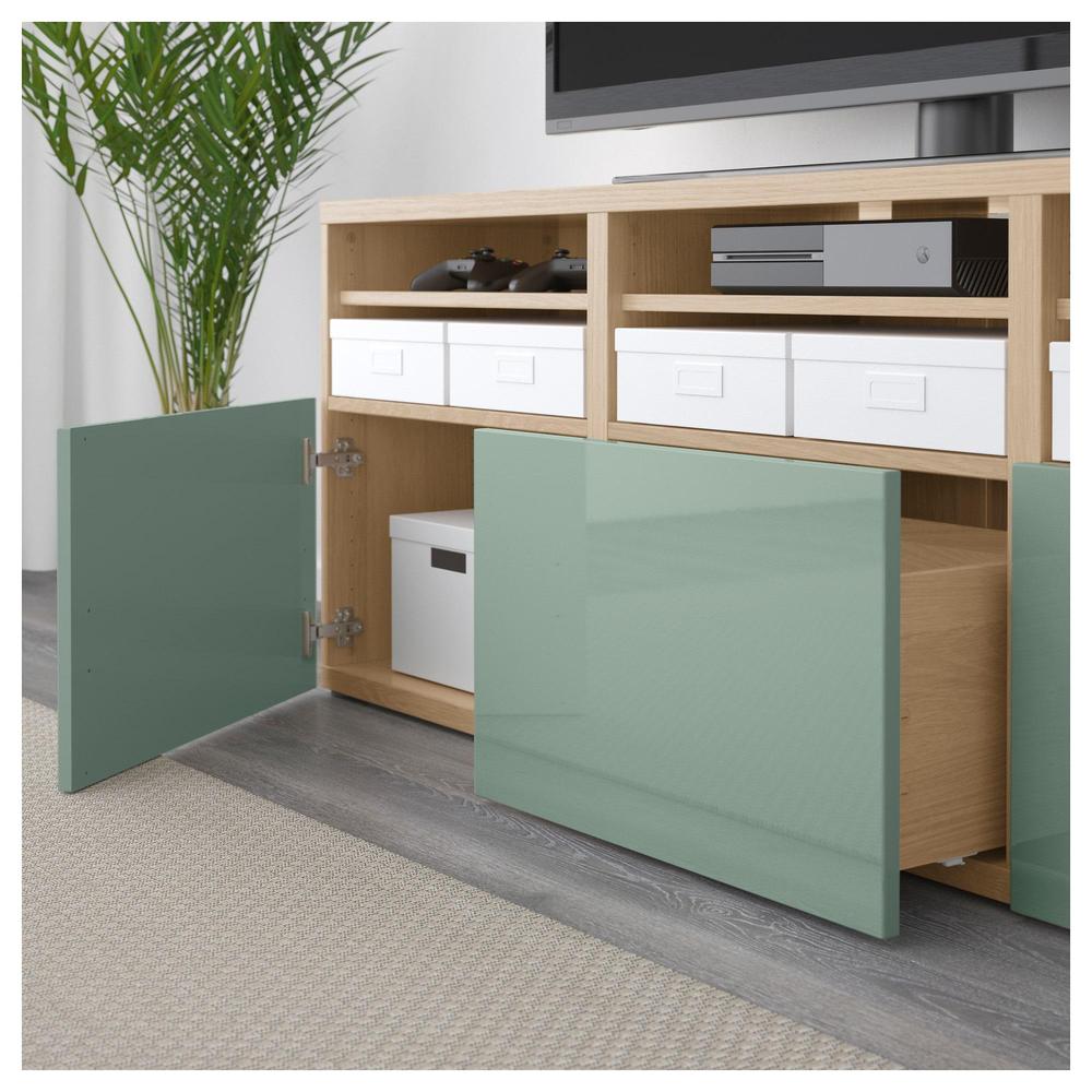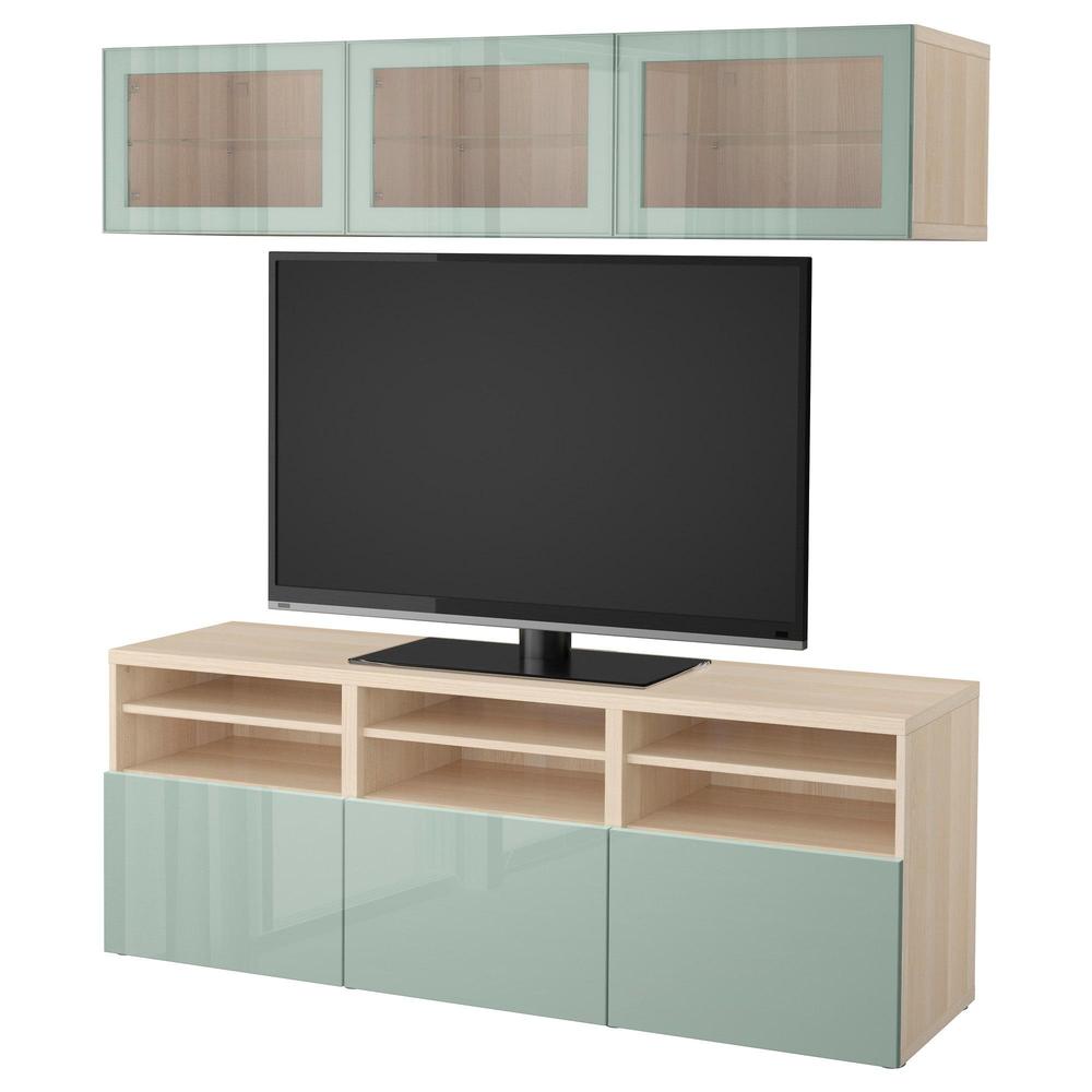 БЕСТО Шкаф для ТВ, комбин/стеклян дверцы - под беленый дуб Сельсвикен/глянцевый/серо-зеленый светлый прозрачное стекло, направляющие ящика,нажимные