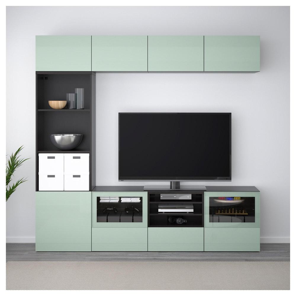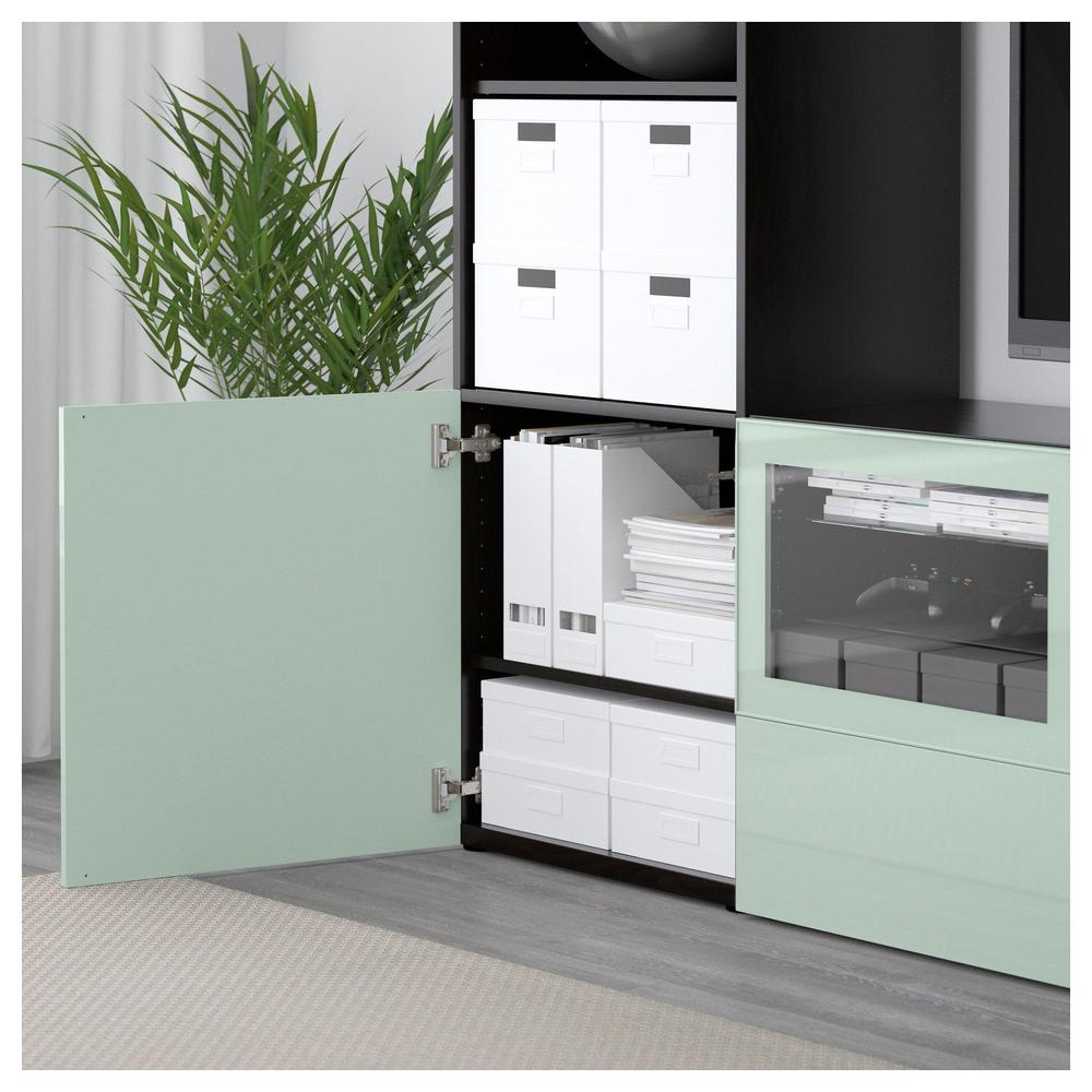 БЕСТО Шкаф для ТВ, комбин/стеклян дверцы - черно-коричневый Сельсвикен/глянцевый/серо-зеленый светлый прозрачное стекло, направляющие ящика,нажимные