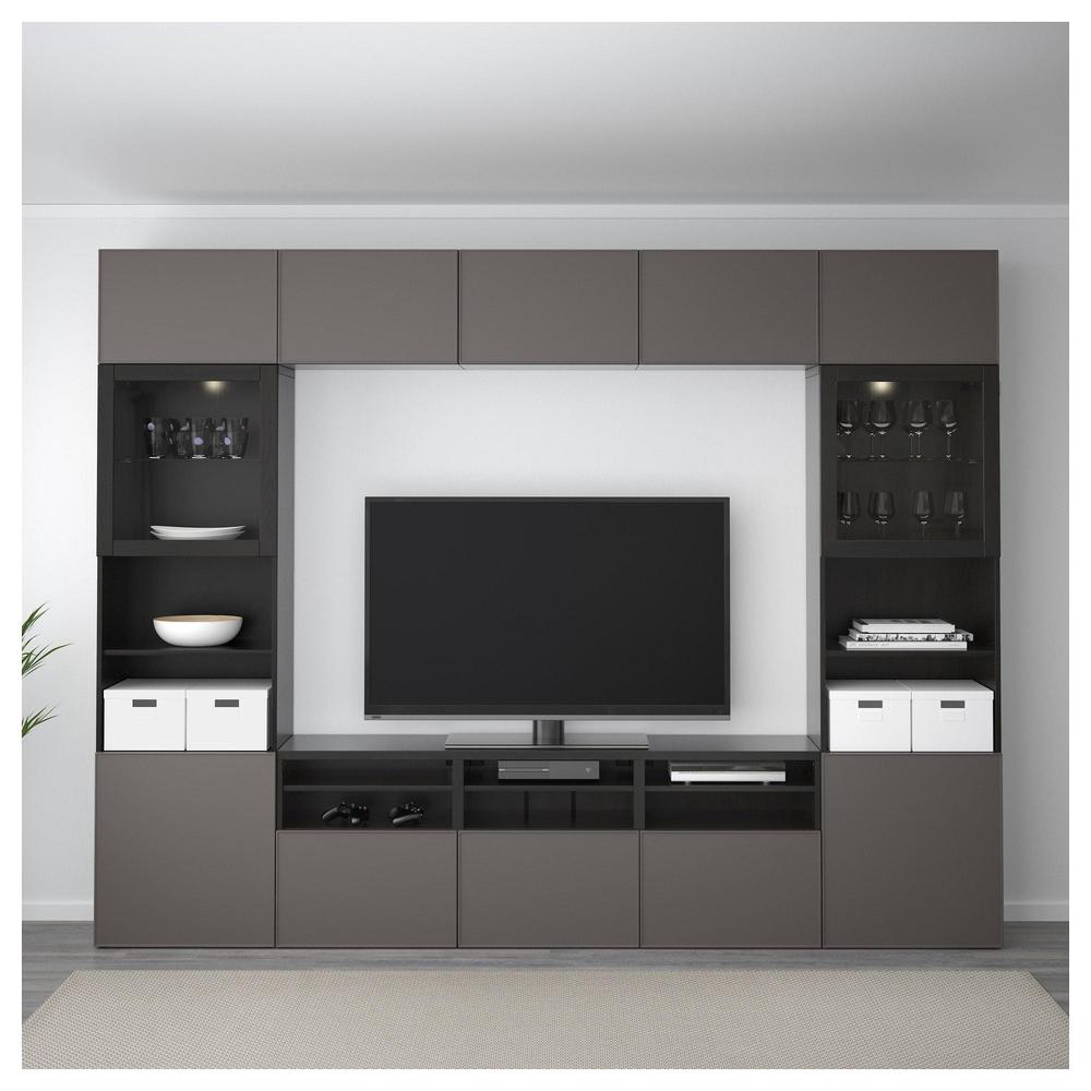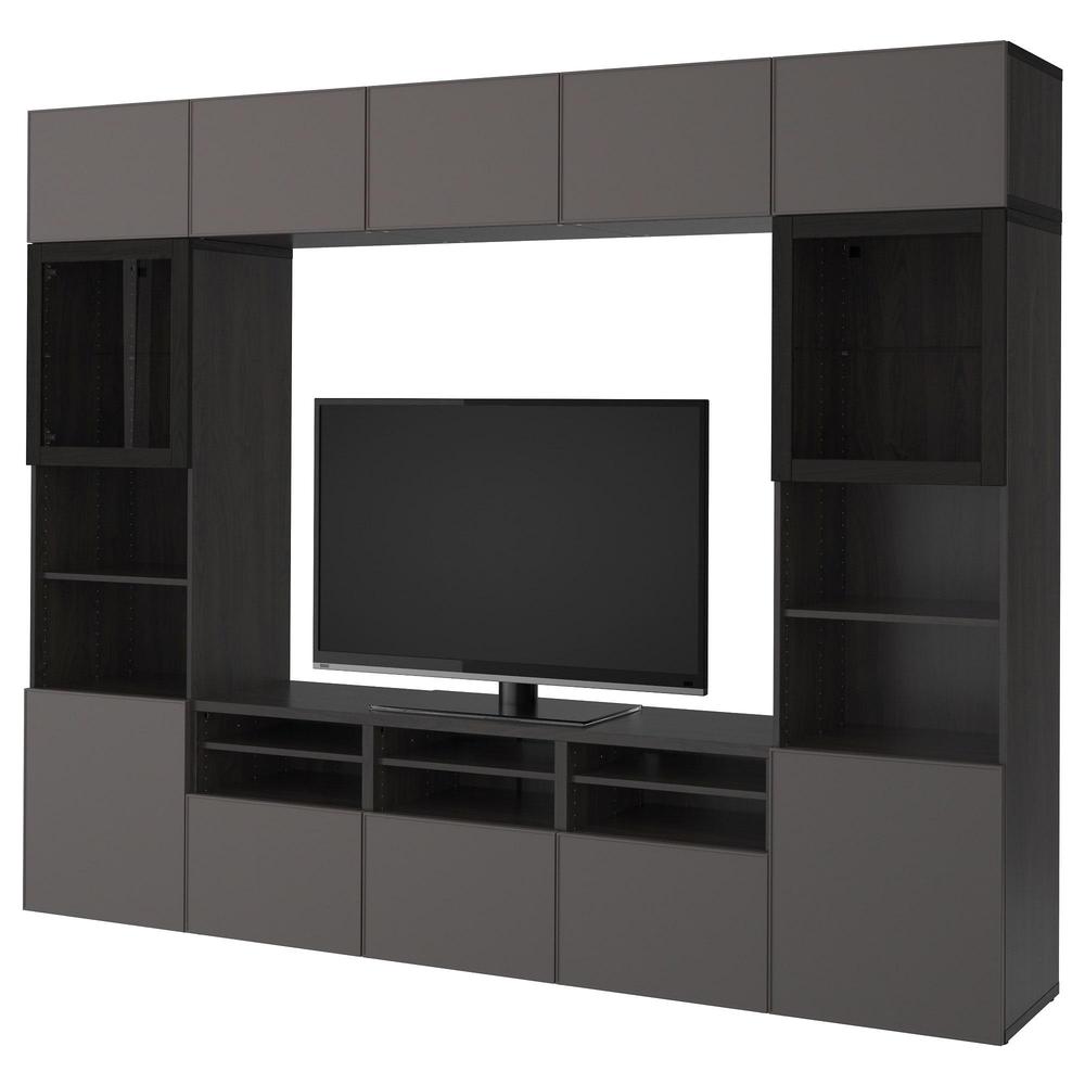 БЕСТО Шкаф для ТВ, комбин/стеклян дверцы - черно-коричневый Грундсвикен/темно-серый прозрачное стекло, направляющие ящика,нажимные