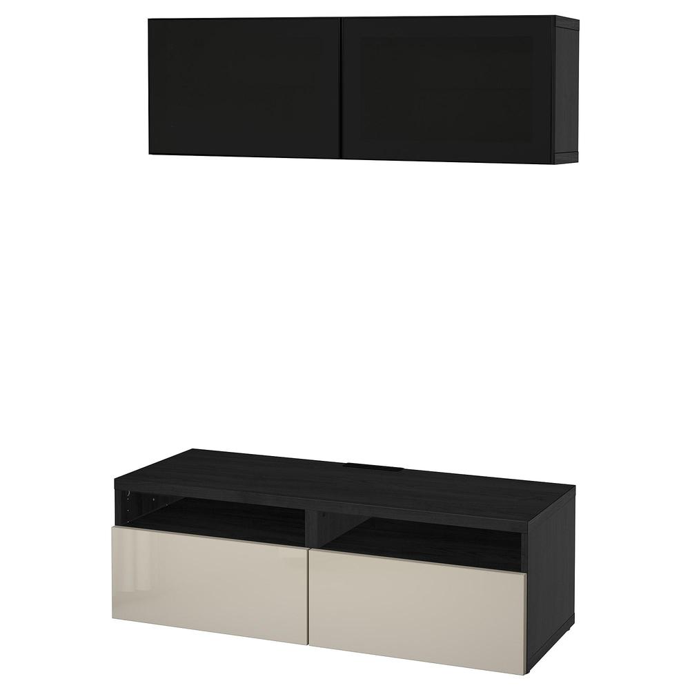 БЕСТО Шкаф для ТВ, комбин/стеклян дверцы - черно-коричневый/Сельсвикен глянцевый/бежевый/дымчатое стекло, направляющие ящика, плавно закр