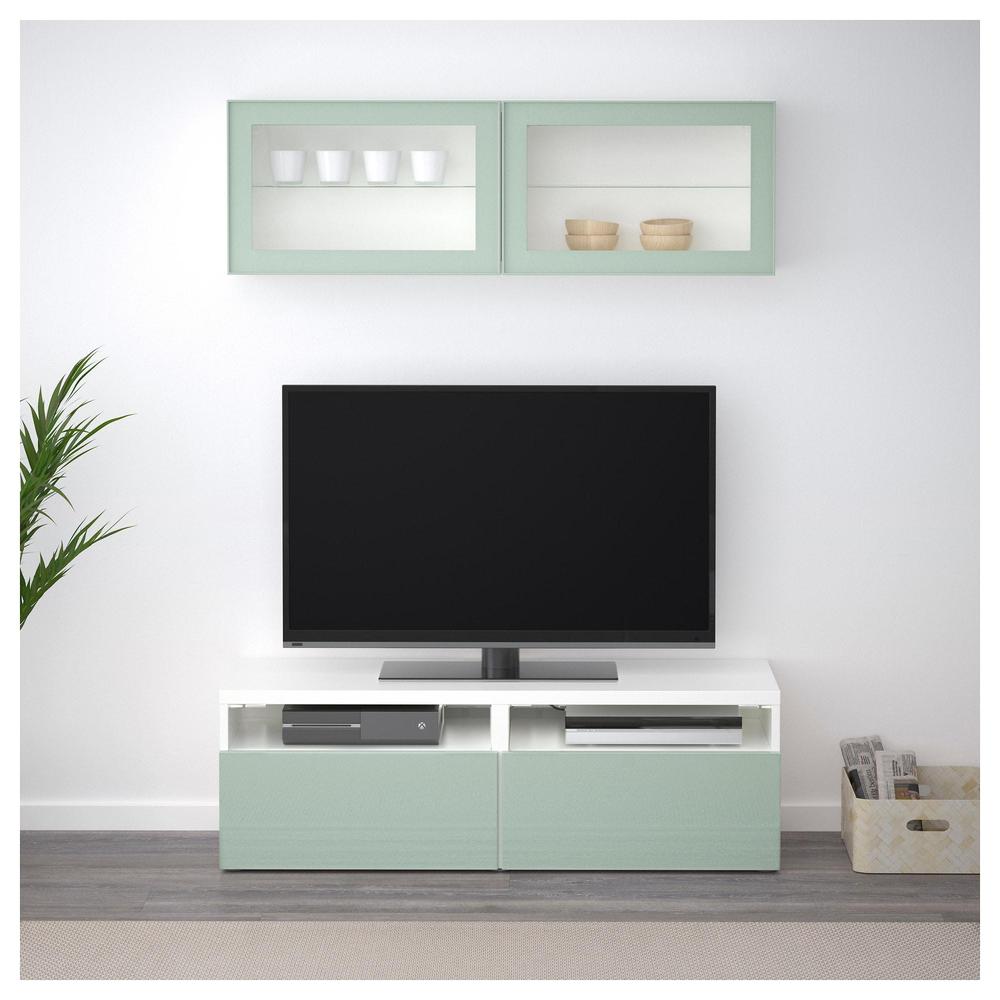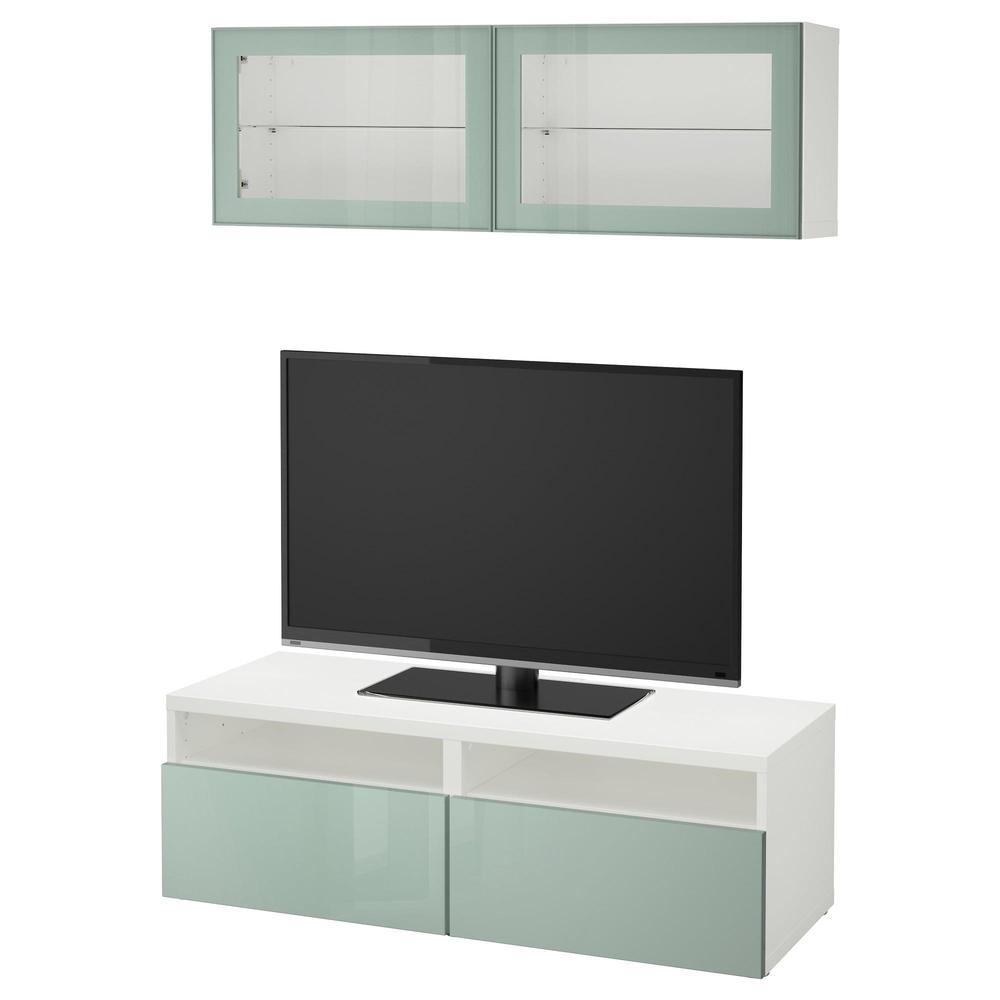 БЕСТО Шкаф для ТВ, комбин/стеклян дверцы - белый Сельсвикен/глянцевый/серо-зеленый светлый прозрачное стекло, направляющие ящика,нажимные 0.0/5 оценка (0 голосов)