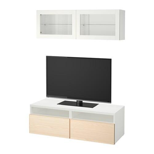 БЕСТО Шкаф для ТВ, комбин/стеклян дверцы - белый Инвикен/ясеневый шпон прозрачное стекло, направляющие ящика,нажимные