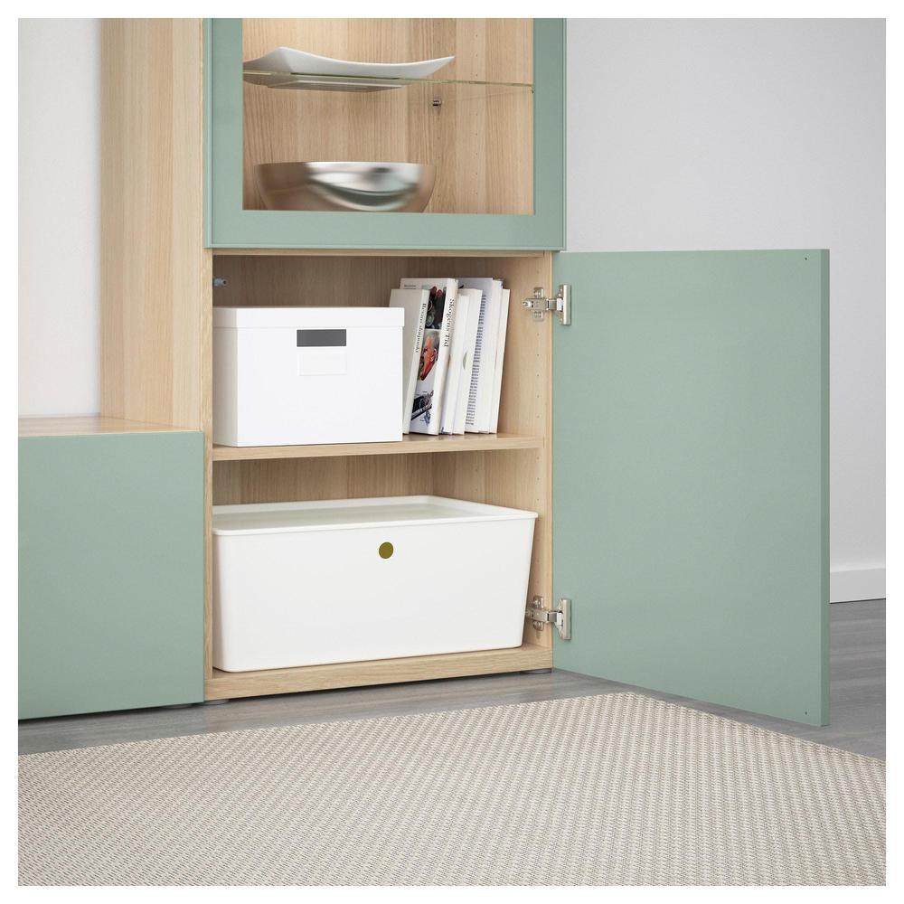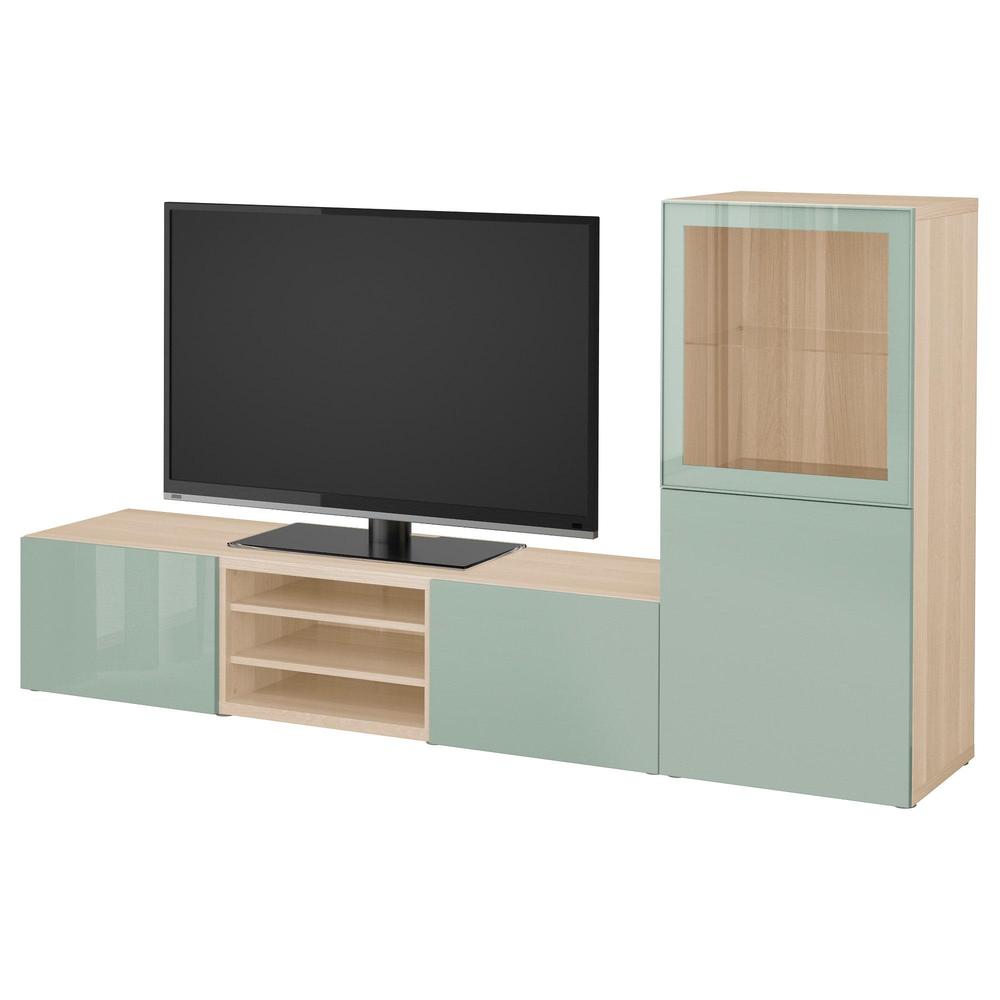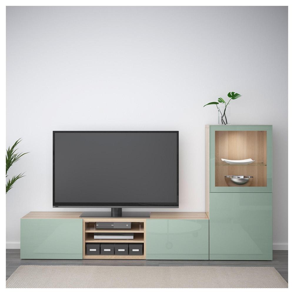 БЕСТО Шкаф для ТВ, комбин/стеклян дверцы - под беленый дуб Сельсвикен/глянцевый/серо-зеленый светлый прозрачное стекло, направляющие ящика, плавно закр