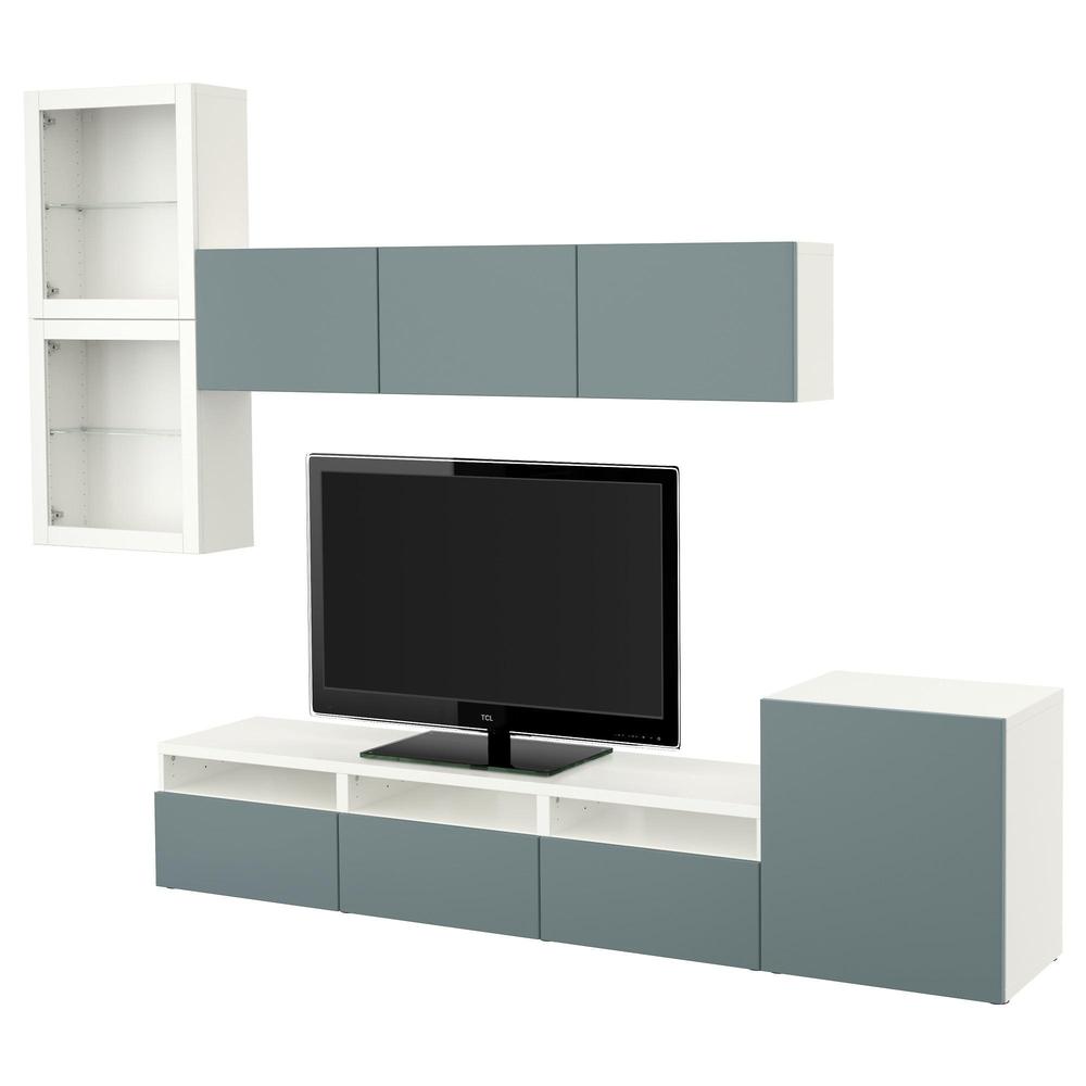 БЕСТО Шкаф для ТВ, комбин/стеклян дверцы - белый/Вальвикен серо-бирюзовый, прозрачное стекло, направляющие ящика,нажимные
