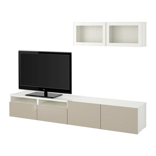 БЕСТО Шкаф для ТВ, комбин/стеклян дверцы - белый/Сельсвикен глянцевый/бежевый прозрачное стекло, направляющие ящика, плавно закр