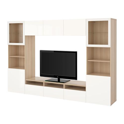 БЕСТО Шкаф для ТВ, комбин/стеклян дверцы - под беленый дуб/Сельсвикен глянцевый/белый прозрачное стекло, направляющие ящика, плавно закр