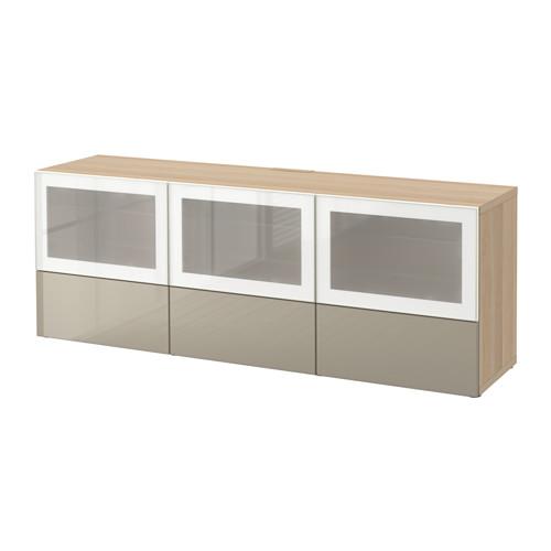 БЕСТО Тумба под ТВ, с дверцами и ящиками - под беленый дуб/Сельсвикен глянцевый/бежевый матовое стекло, направляющие ящика, плавно закр