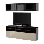 БЕСТО Шкаф для ТВ, комбин/стеклян дверцы - черно-коричневый/Сельсвикен глянцевый/бежевый прозрачное стекло, направляющие ящика,нажимные