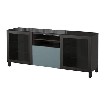 БЕСТО Тумба под ТВ - черно-коричневый/Вальвикен серо-бирюзовый, прозрачное стекло, направляющие ящика,нажимные
