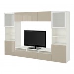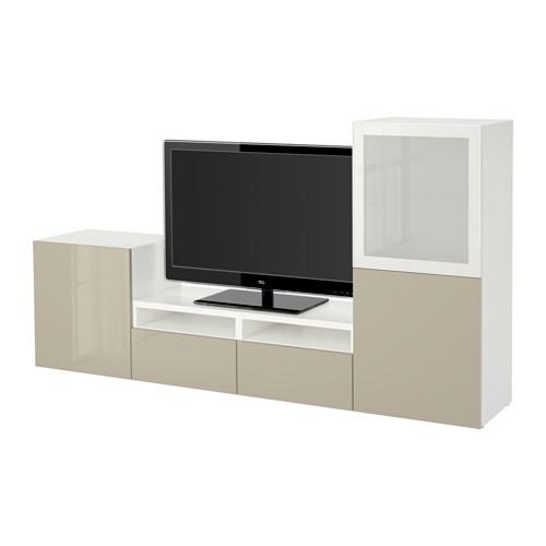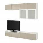 БЕСТО Шкаф для ТВ, комбин/стеклян дверцы - белый/Сельсвикен глянцевый/бежевый матовое стекло, направляющие ящика, плавно закр