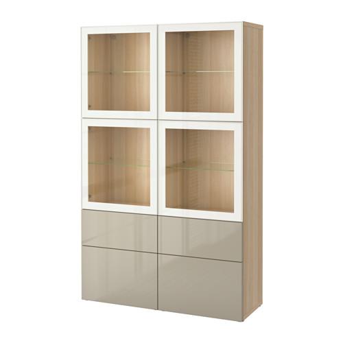 БЕСТО Комбинация д/хранения+стекл дверц - под беленый дуб/Сельсвикен глянцевый/бежевый прозрачное стекло, направляющие ящика, плавно закр