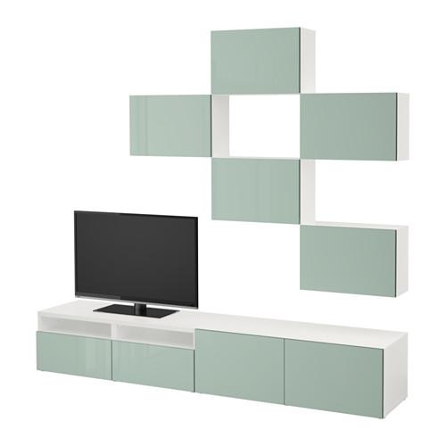 БЕСТО Шкаф для ТВ, комбинация - белый/Сельсвикен глянцевый/серо-зеленый светлый, направляющие ящика,нажимные