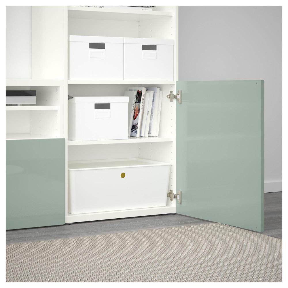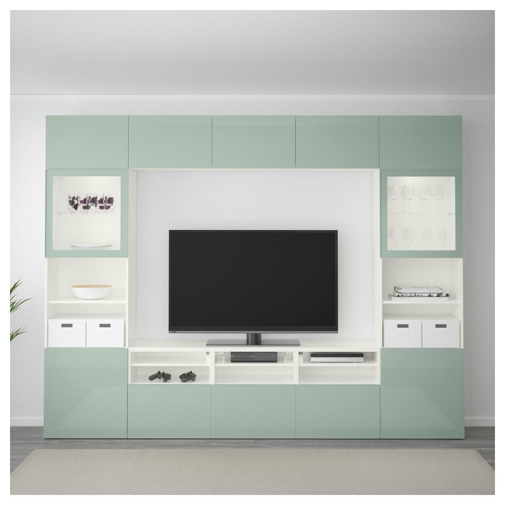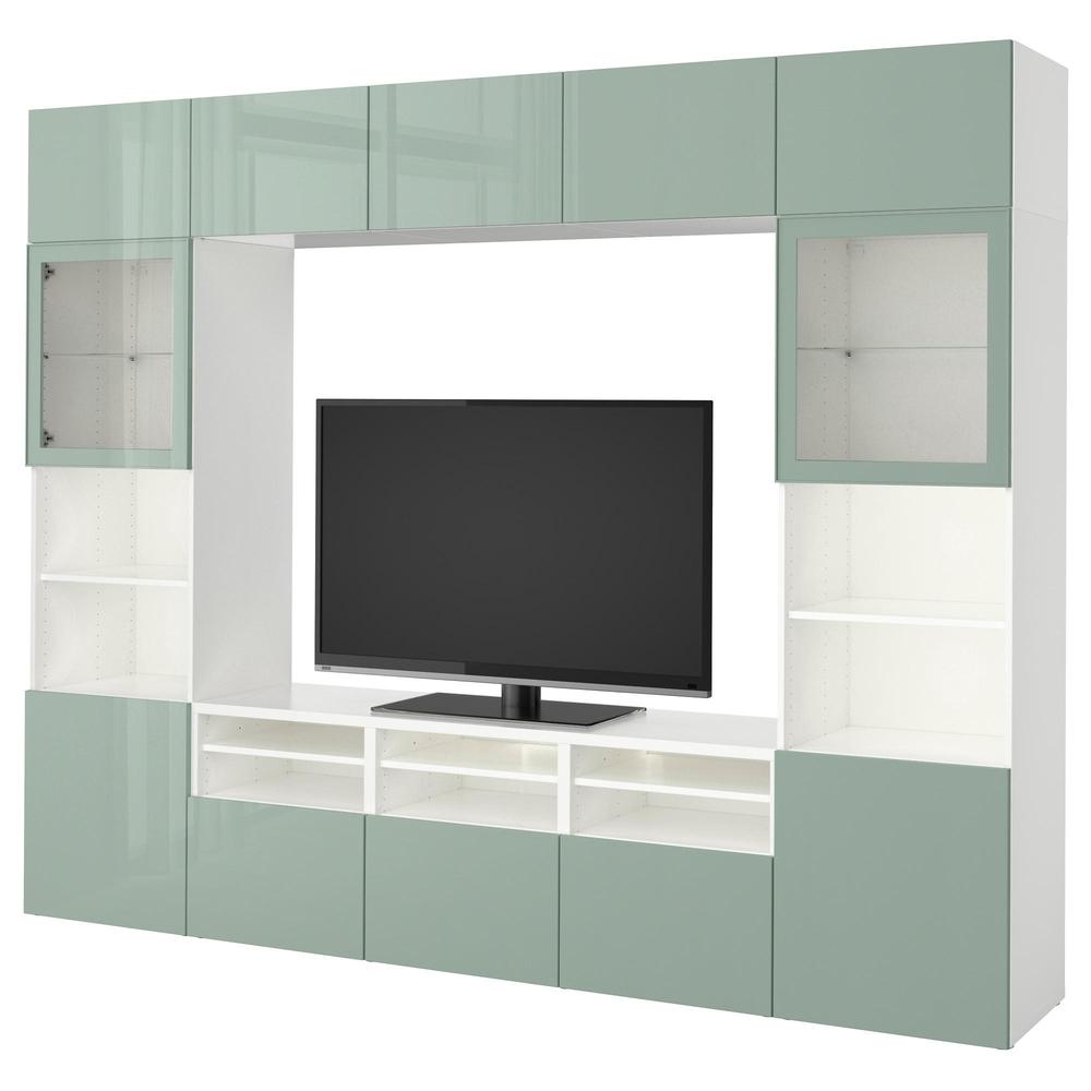 БЕСТО Шкаф для ТВ, комбин/стеклян дверцы - белый Сельсвикен/глянцевый/серо-зеленый светлый прозрачное стекло, направляющие ящика,нажимные