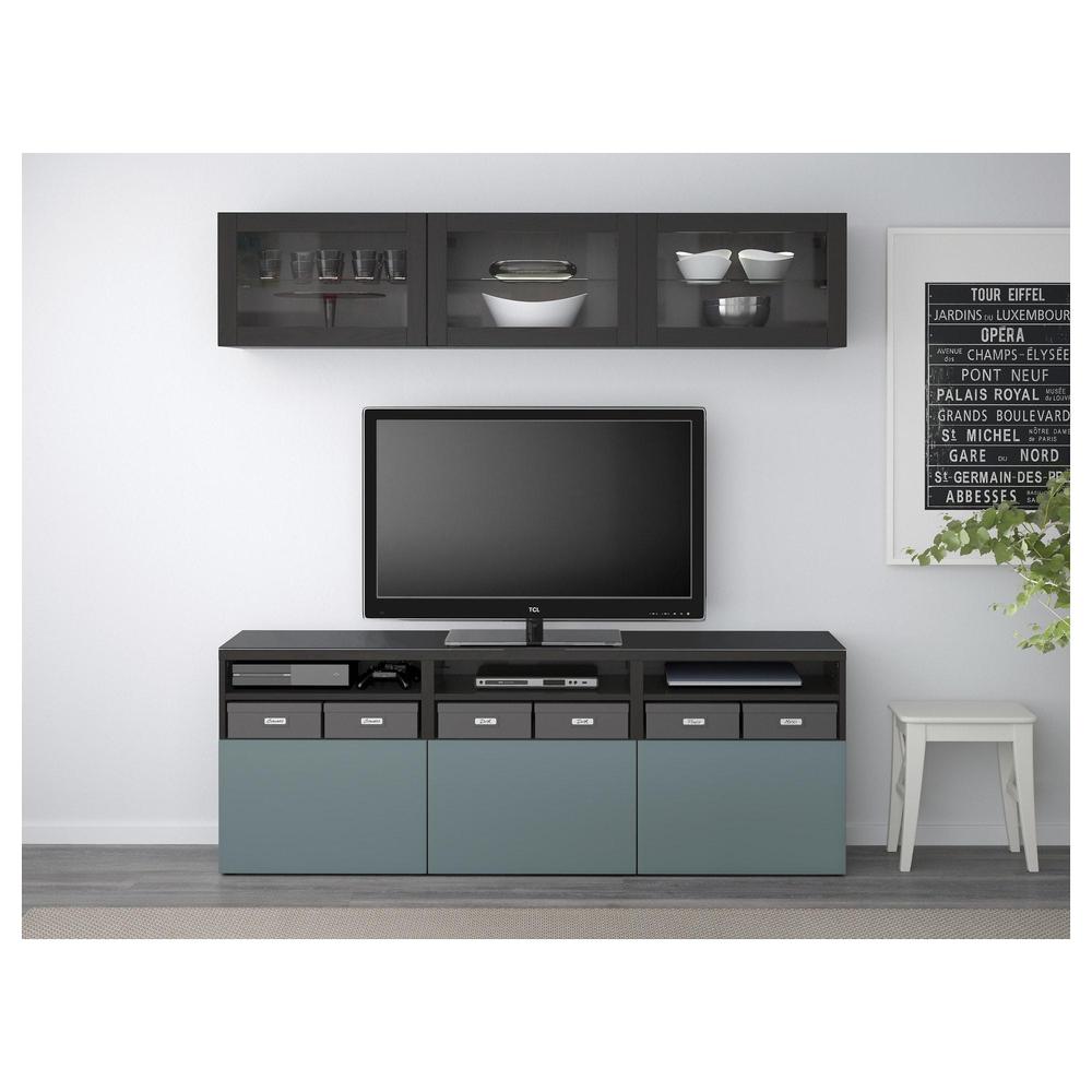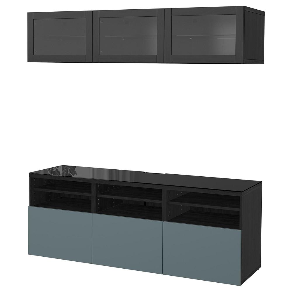 БЕСТО Шкаф для ТВ, комбин/стеклян дверцы - черно-коричневый/Вальвикен серо-бирюзовый, прозрачное стекло, направляющие ящика, плавно закр