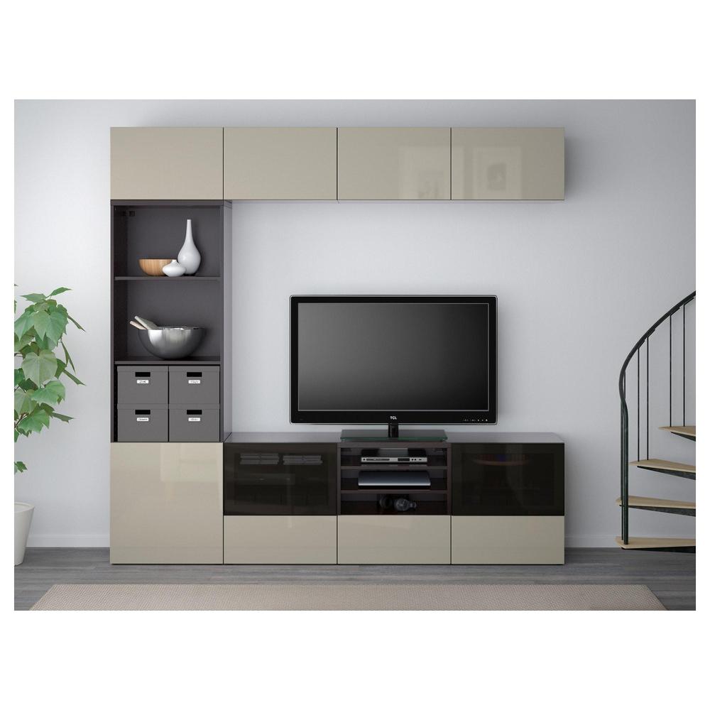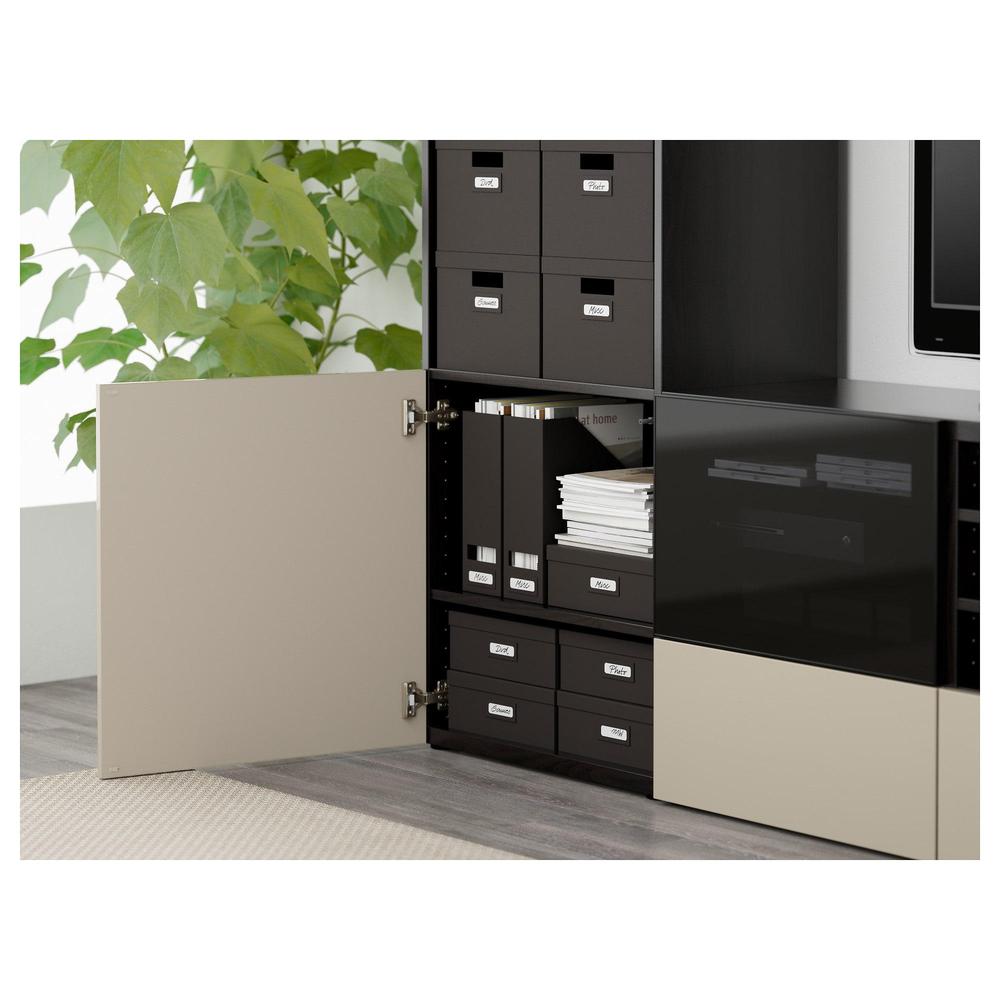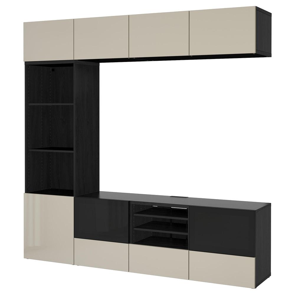 БЕСТО Шкаф для ТВ, комбин/стеклян дверцы - черно-коричневый/Сельсвикен глянцевый/бежевый/дымчатое стекло, направляющие ящика, плавно закр