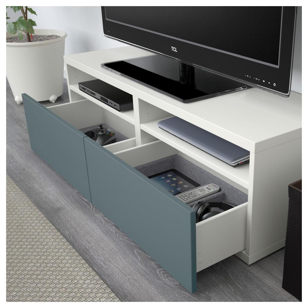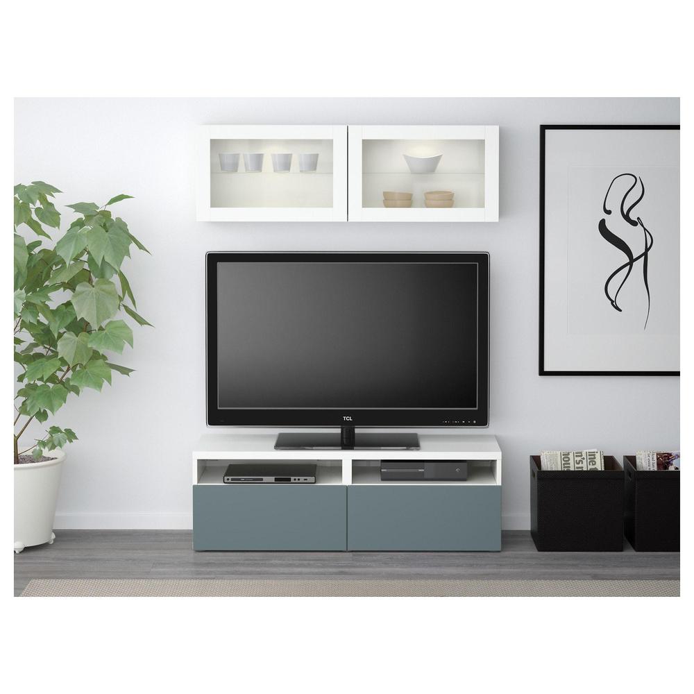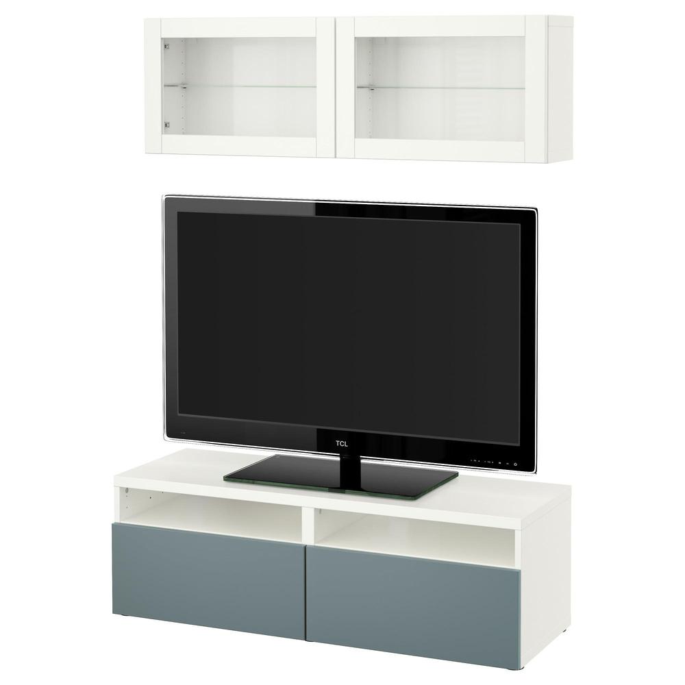 БЕСТО Шкаф для ТВ, комбин/стеклян дверцы - белый/Вальвикен серо-бирюзовый, прозрачное стекло, направляющие ящика,нажимные