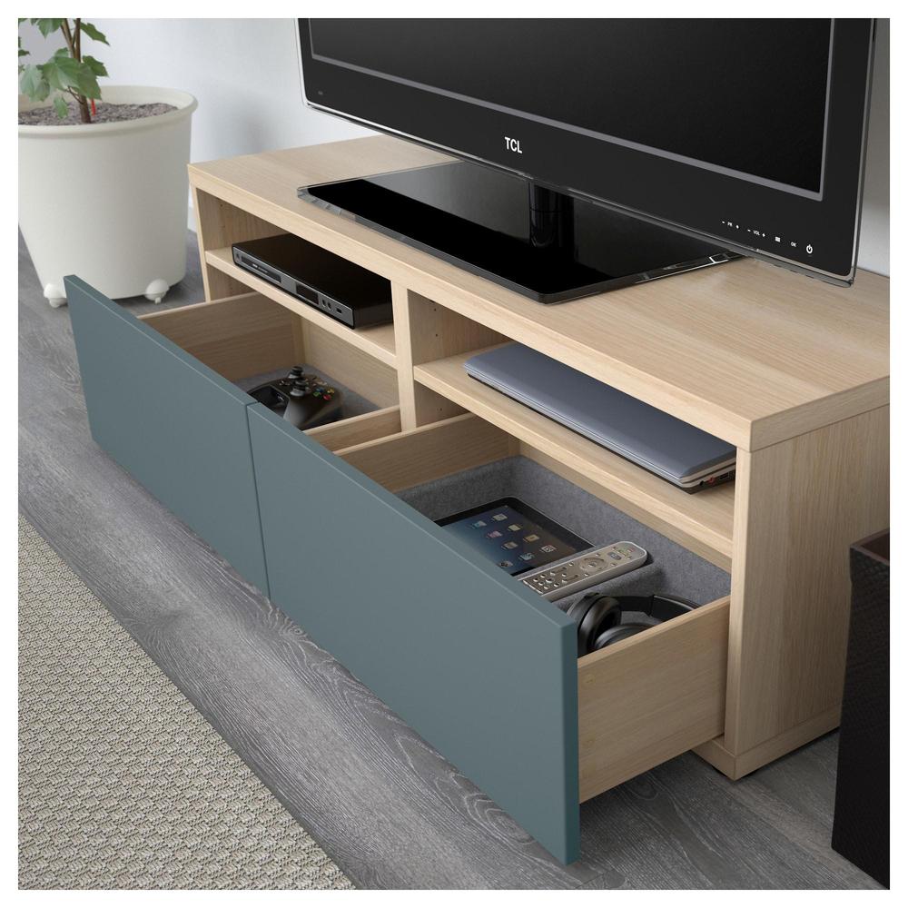 БЕСТО Шкаф для ТВ, комбин/стеклян дверцы - под беленый дуб/Вальвикен серо-бирюзовый, прозрачное стекло, направляющие ящика,нажимные