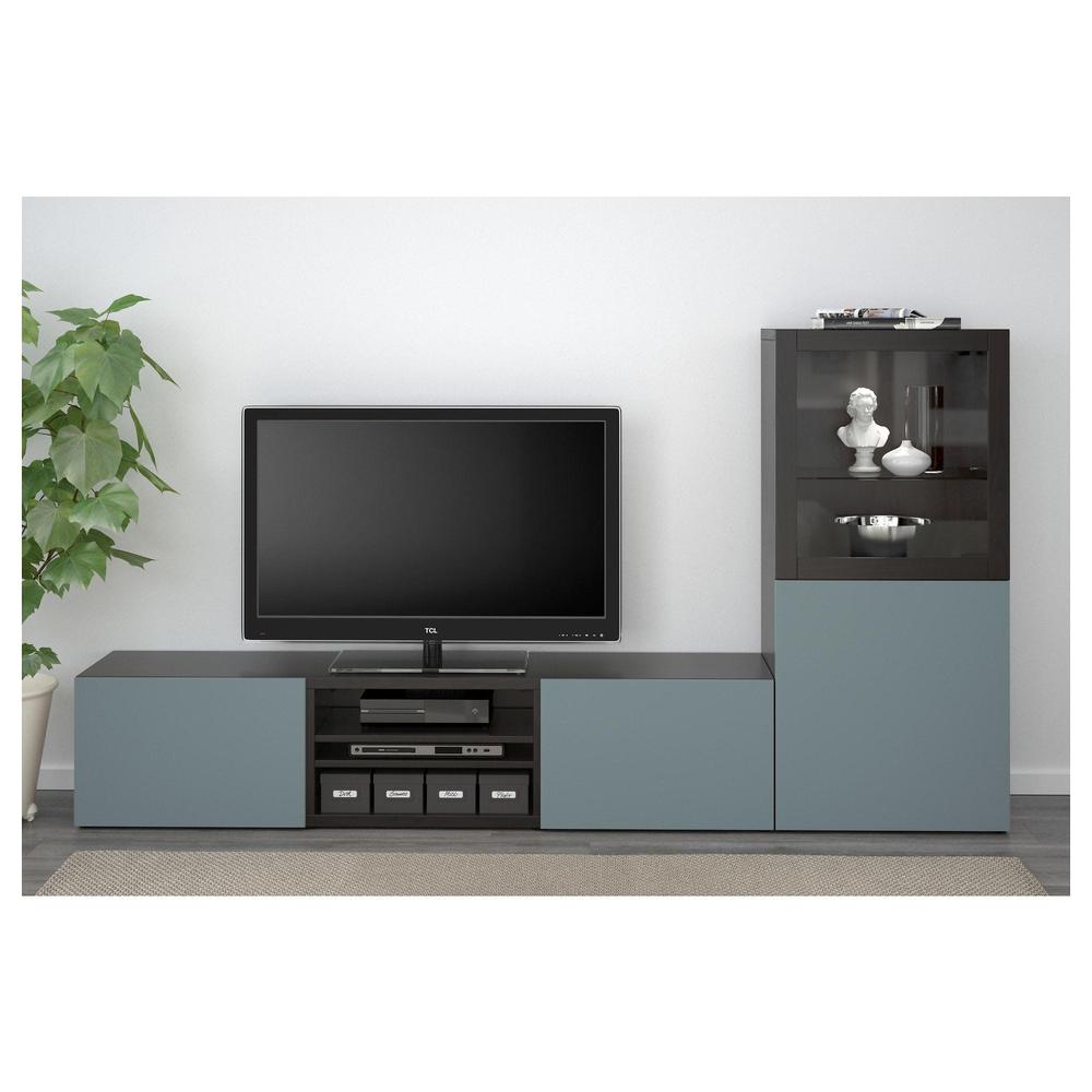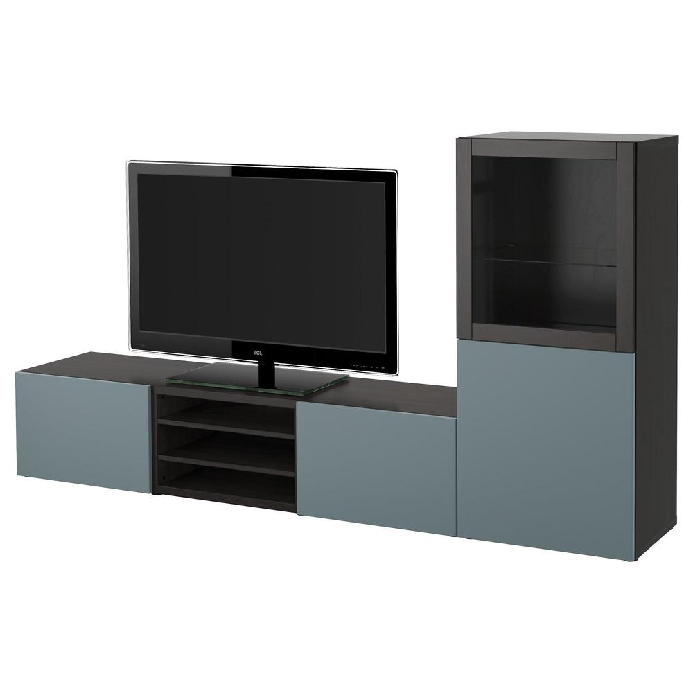 БЕСТО Шкаф для ТВ, комбин/стеклян дверцы - черно-коричневый/Вальвикен серо-бирюзовый, прозрачное стекло, направляющие ящика,нажимные