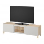 БЕСТО Тумба под ТВ с ящиками и дверцей - под беленый дуб/Лаппвикен светло-серый прозрачное стекло, направляющие ящика,нажимные