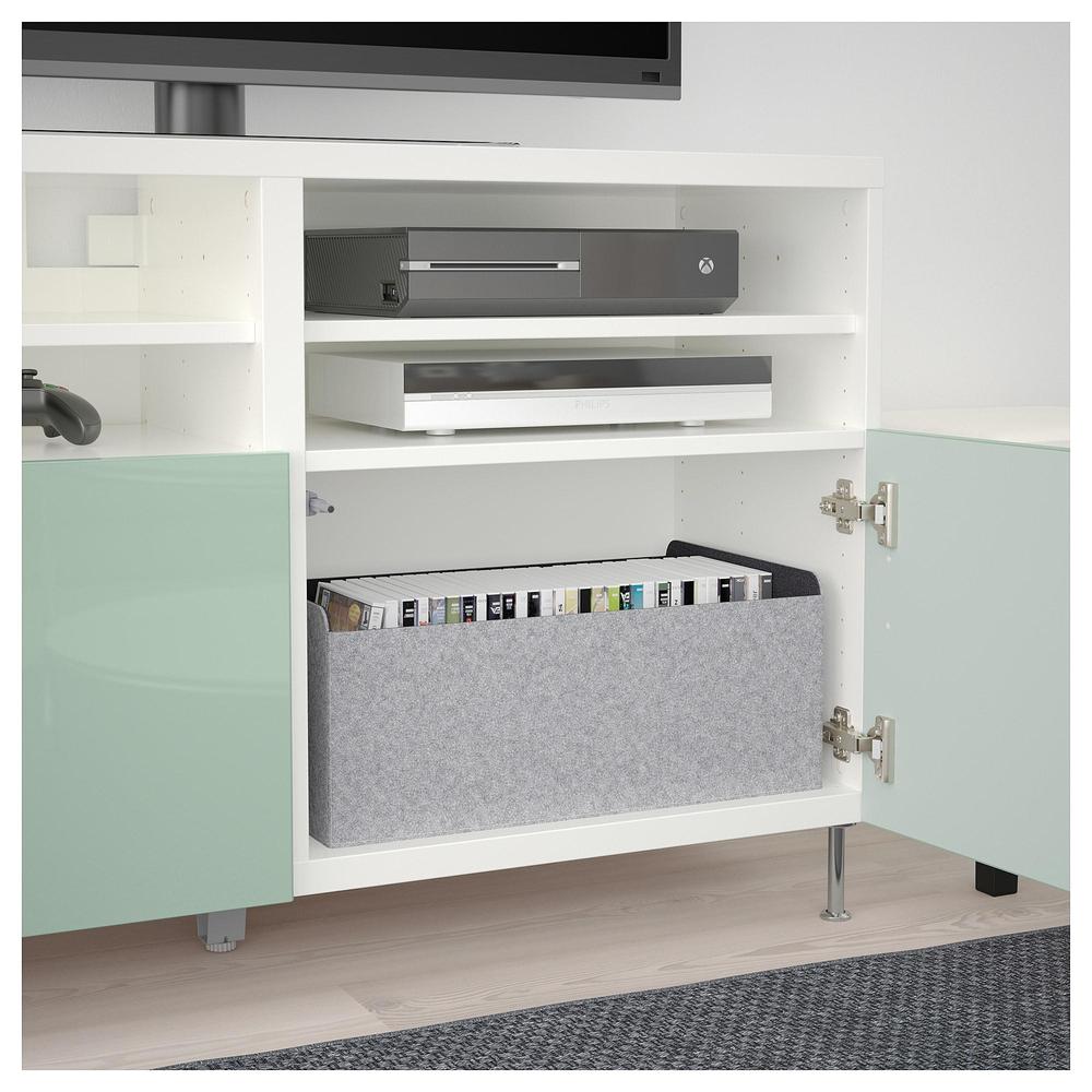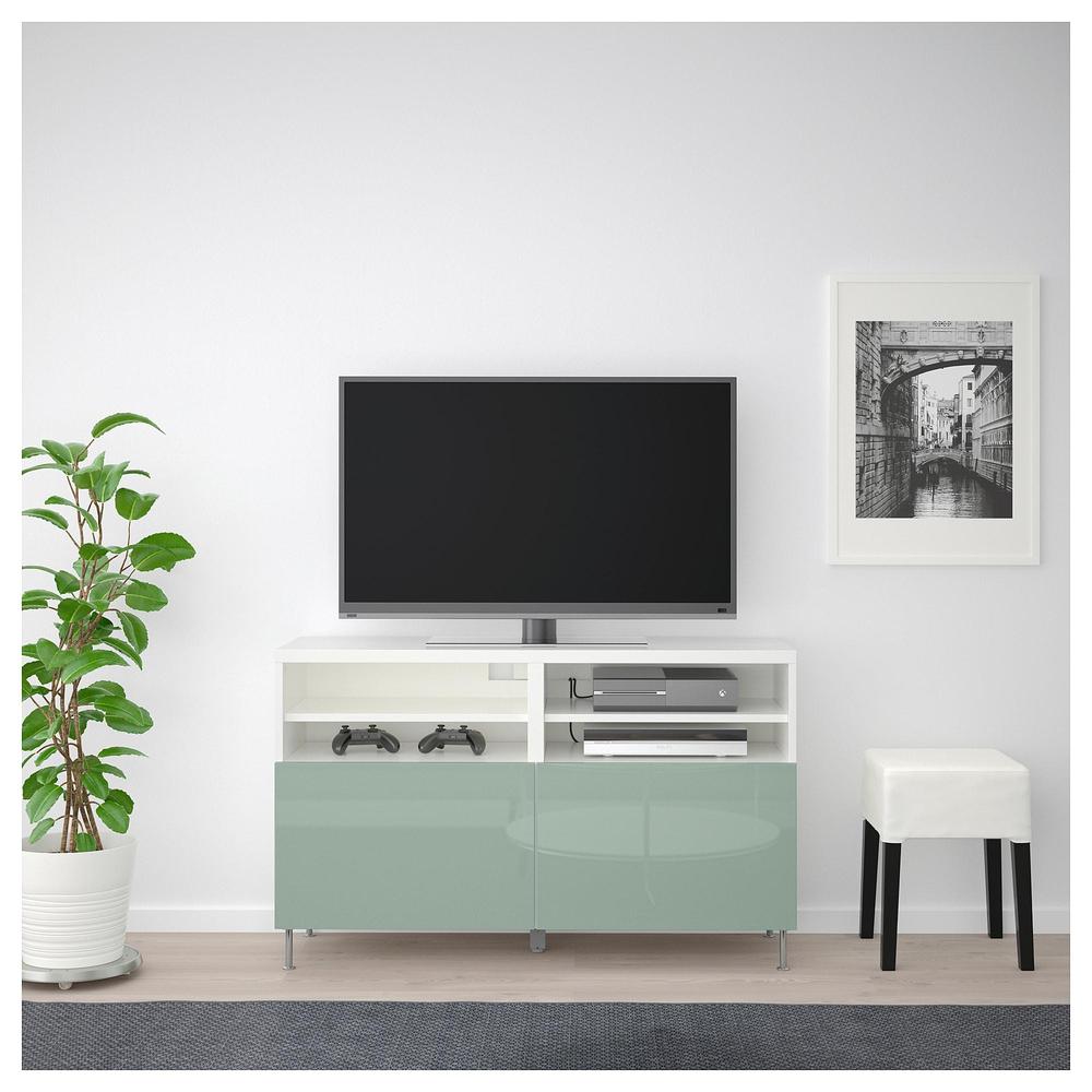 БЕСТО Тумба под ТВ, с дверцами - белый глянцевый/серо-зеленый светлый