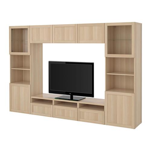 БЕСТО Шкаф для ТВ, комбин/стеклян дверцы - Ханвикен/Синдвик под беленый дуб, прозрачное стелко, направляющие ящика, плавно закр