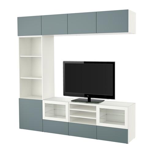 БЕСТО Шкаф для ТВ, комбин/стеклян дверцы - белый/Вальвикен серо-бирюзовый, прозрачное стекло, направляющие ящика, плавно закр