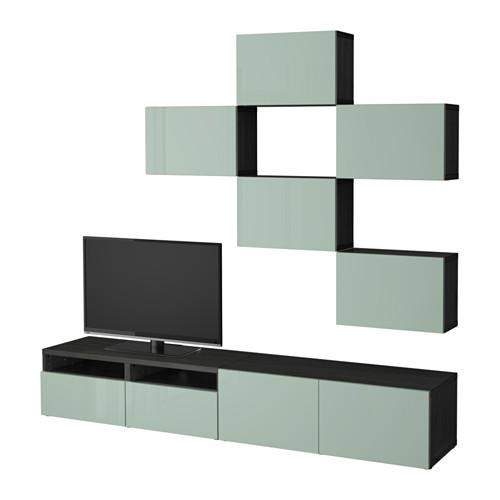 БЕСТО Шкаф для ТВ, комбинация - черно-коричневый/Сельсвикен глянцевый/серо-зеленый светлый, направляющие ящика,нажимные