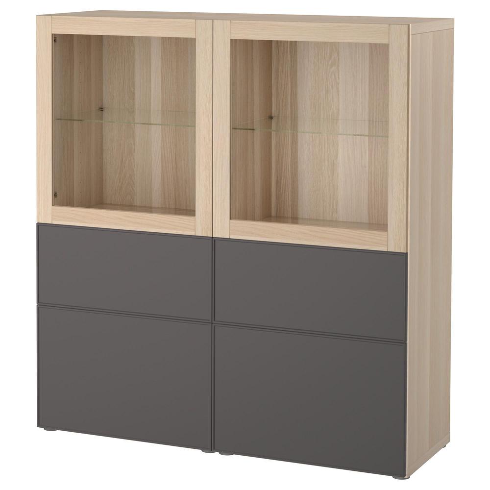 БЕСТО Комбинация д/хранения+стекл дверц - под беленый дуб Грундсвикен/темно-серый прозрачное стекло, направляющие ящика, плавно закр