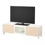 БЕСТО Тумба под ТВ, с дверцами и ящиками - белый Инвикен/ясеневый шпон прозрачное стекло, направляющие ящика,нажимные