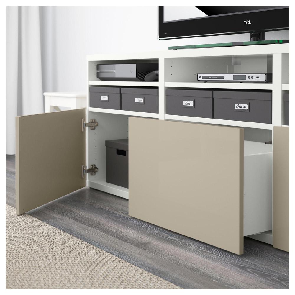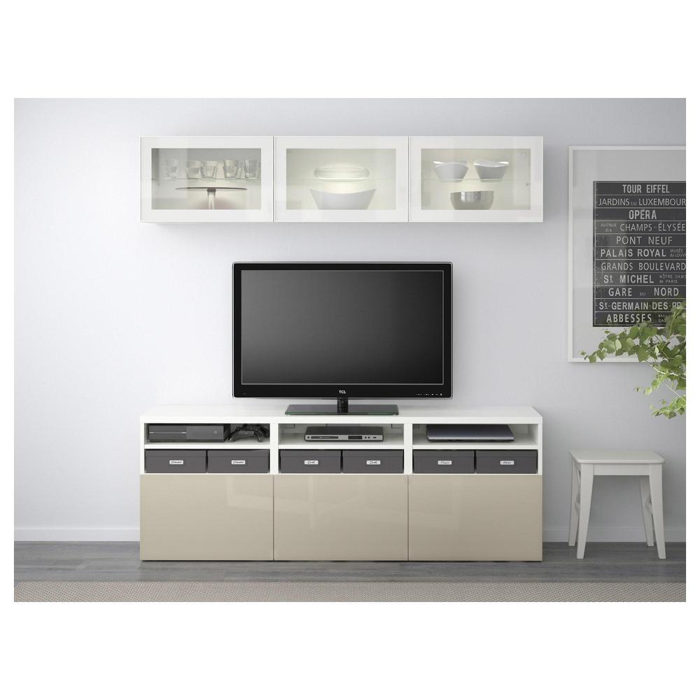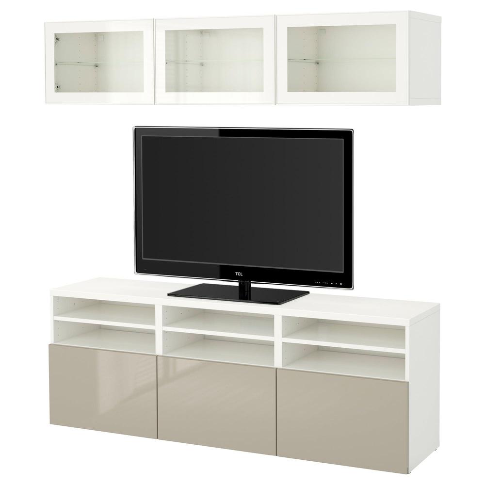 БЕСТО Шкаф для ТВ, комбин/стеклян дверцы - белый/Сельсвикен глянцевый/бежевый прозрачное стекло, направляющие ящика,нажимные