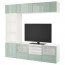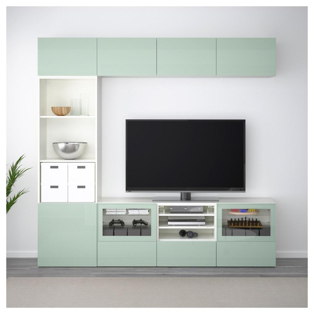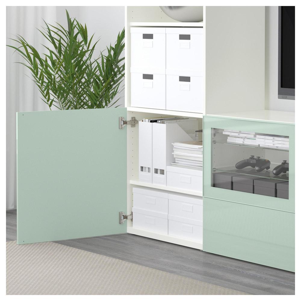 БЕСТО Шкаф для ТВ, комбин/стеклян дверцы - белый Сельсвикен/глянцевый/серо-зеленый светлый прозрачное стекло, направляющие ящика,нажимные