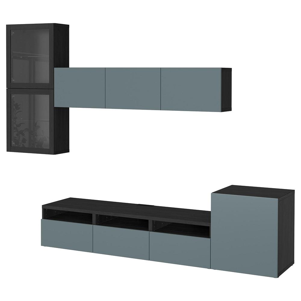БЕСТО Шкаф для ТВ, комбин/стеклян дверцы - черно-коричневый/Вальвикен серо-бирюзовый, прозрачное стекло, направляющие ящика, плавно закр
