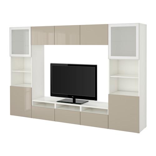 БЕСТО Шкаф для ТВ, комбин/стеклян дверцы - белый/Сельсвикен глянцевый/бежевый матовое стекло, направляющие ящика,нажимные