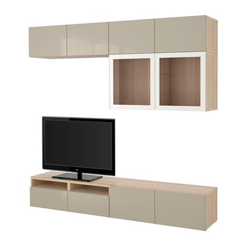 БЕСТО Шкаф для ТВ, комбин/стеклян дверцы - под беленый дуб/Сельсвикен глянцевый/бежевый прозрачное стекло, направляющие ящика, плавно закр