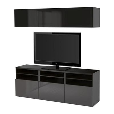 БЕСТО Шкаф для ТВ, комбин/стеклян дверцы - черно-коричневый/Сельсвикен глянцевый/серый дымчатое стекло, направляющие ящика,нажимные