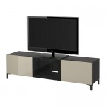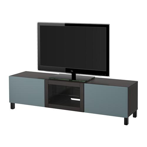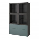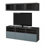 БЕСТО Тумба под ТВ с ящиками и дверцей - черно-коричневый/Вальвикен серо-бирюзовый, прозрачное стекло, направляющие ящика, плавно закр