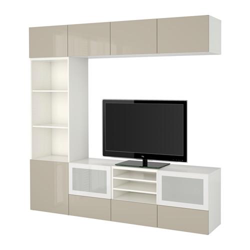 БЕСТО Шкаф для ТВ, комбин/стеклян дверцы - белый/Сельсвикен глянцевый/бежевый матовое стекло, направляющие ящика, плавно закр