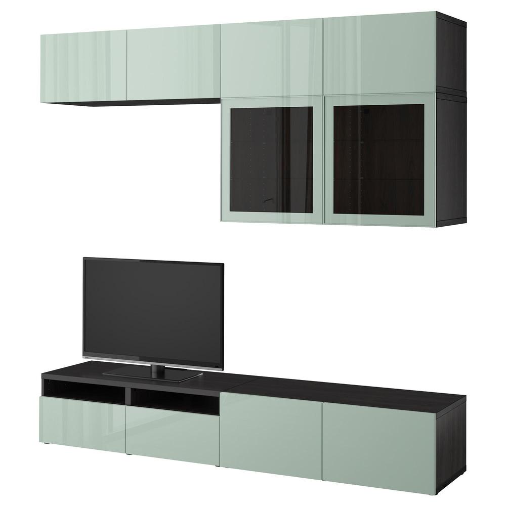 БЕСТО Шкаф для ТВ, комбин/стеклян дверцы - черно-коричневый Сельсвикен/глянцевый/серо-зеленый светлый прозрачное стекло, направляющие ящика, плавно закр