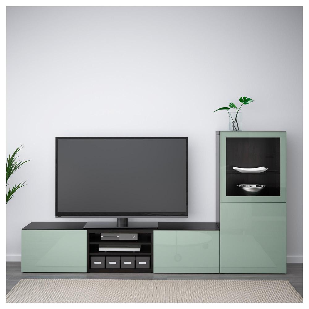 БЕСТО Шкаф для ТВ, комбин/стеклян дверцы - черно-коричневый Сельсвикен/глянцевый/серо-зеленый светлый прозрачное стекло, направляющие ящика, плавно закр