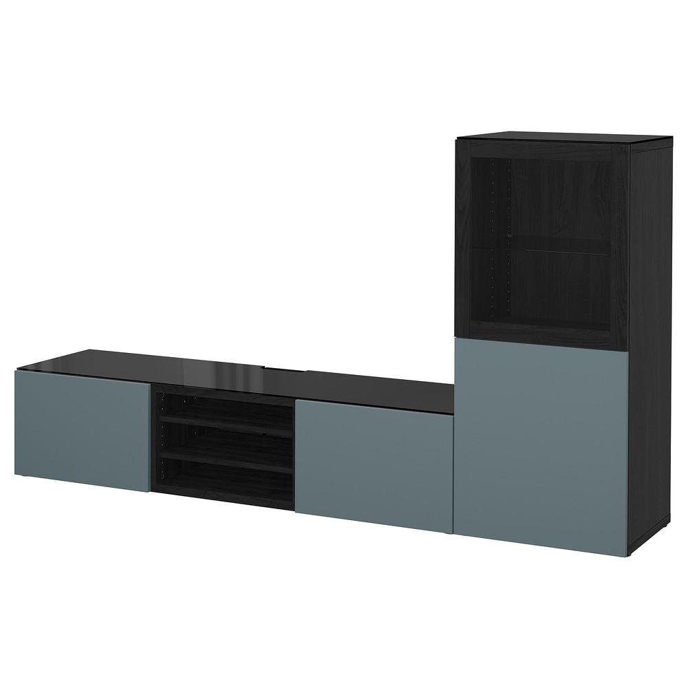 БЕСТО Шкаф для ТВ, комбин/стеклян дверцы - черно-коричневый/Вальвикен серо-бирюзовый, прозрачное стекло, направляющие ящика,нажимные