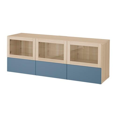 БЕСТО Тумба под ТВ, с дверцами и ящиками - под беленый дуб Вальвикен/темно-синий прозрачное стекло, направляющие ящика,нажимные