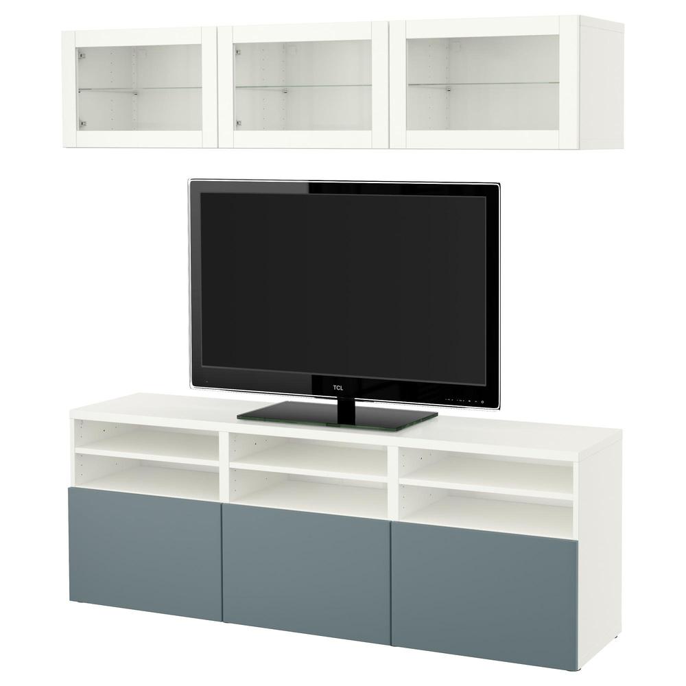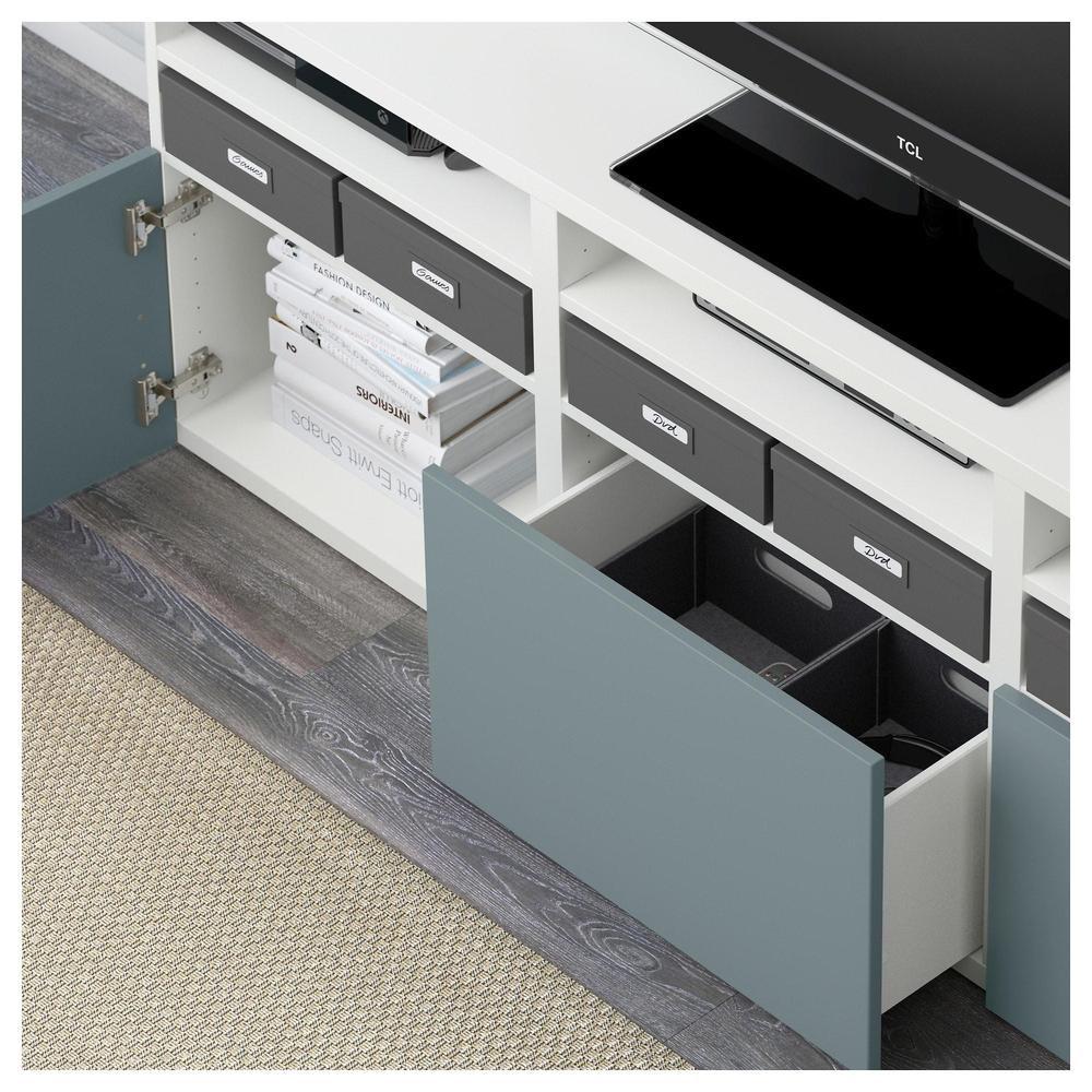 БЕСТО Шкаф для ТВ, комбин/стеклян дверцы - белый/Вальвикен серо-бирюзовый, прозрачное стекло, направляющие ящика,нажимные
