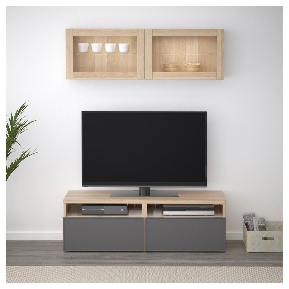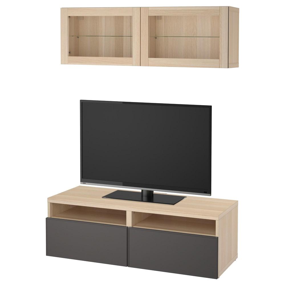 БЕСТО Шкаф для ТВ, комбин/стеклян дверцы - под беленый дуб Грундсвикен/темно-серый прозрачное стекло, направляющие ящика,нажимные